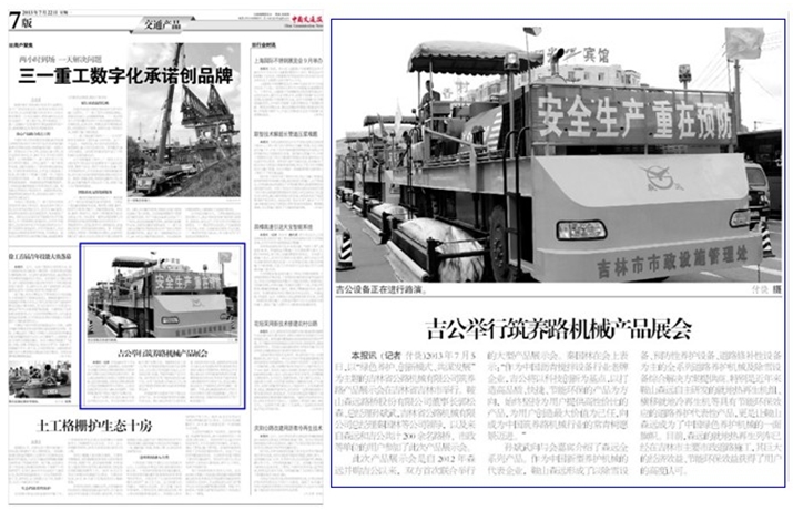 展示會得到諸多網(wǎng)絡(luò)媒體紛紛報道的同時,主流媒體平臺《中國交通報》也于2013年7月22日第七版對此次展會進行了報道,高度肯定了森遠、吉公在綠色筑養(yǎng)路行業(yè)新發(fā)展形勢下的旗幟作用,充分見證了森遠、吉公以諸多代表性產(chǎn)品服務(wù)市政道路建設(shè)、贏得行業(yè)市場、獲得用戶認可的不爭事實。